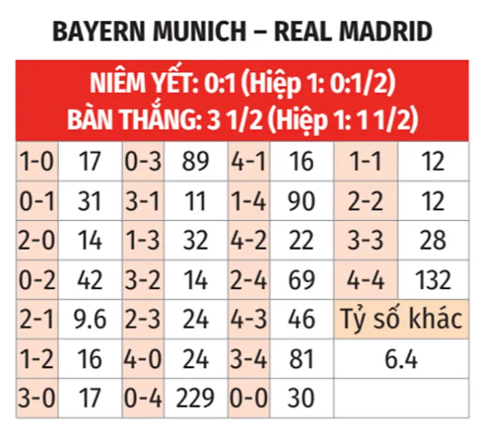 - Tỷ số lẻ: 12/13 trận gần đây của Real và 3 trận liên tiếp của Bayern đều kết thúc với tổng bàn thắng là số lẻ.