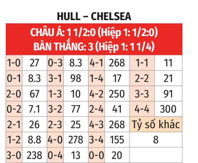 - Lợi thế kèo châu Á: Chelsea thường xuyên thắng kèo châu Á khi đối đầu Hull (3/4 lần gần nhất). Với phong độ sân khách ấn tượng (thắng kèo 7/9 trận), The Blues được đánh giá cao.