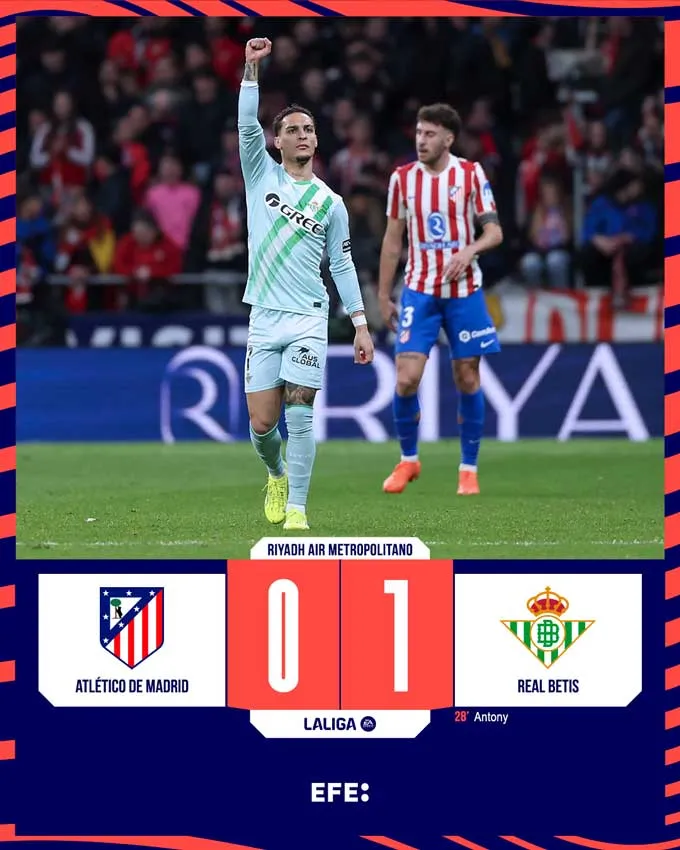 Trong khi đó, Atletico Madrid đã nhận cú sốc ngay tại sân nhà Wanda Metropolitano trước Real Betis. Pha dứt điểm từ xa đầy táo bạo của Antony ở phút 28 đã trở thành điểm nhấn duy nhất của trận đấu, khiến thủ môn Jan Oblak bất ngờ và bất lực.