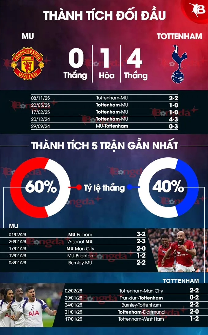 - Cả hai đội cùng ghi bàn: 16/20 trận của MU và toàn bộ 6 trận gần đây của Tottenham tại Ngoại hạng Anh đều chứng kiến cả hai đội cùng xé lưới đối phương. Với hàng công đang lên của MU và sự dễ dàng thủng lưới của Spurs, kịch bản này rất dễ lặp lại.