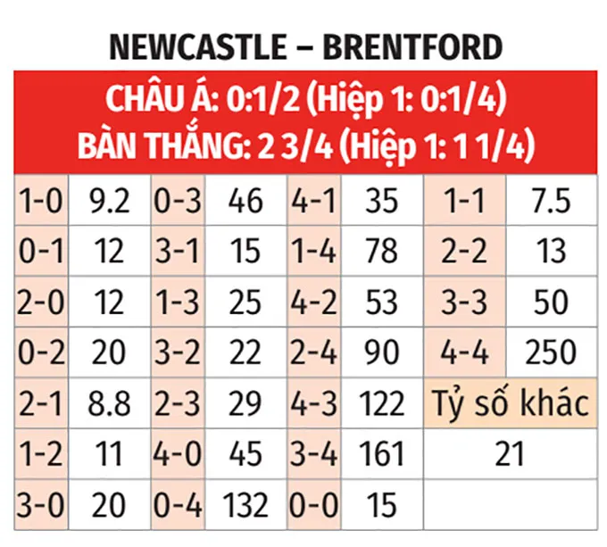 - Newcastle thường thua hiệp 1: Thống kê châu Á cho thấy Newcastle hay gặp khó khăn ngay từ đầu trận. Điều này càng đáng lo khi đối thủ của họ, Brentford, thắng hiệp 1 ở 4/6 trận gần nhất.